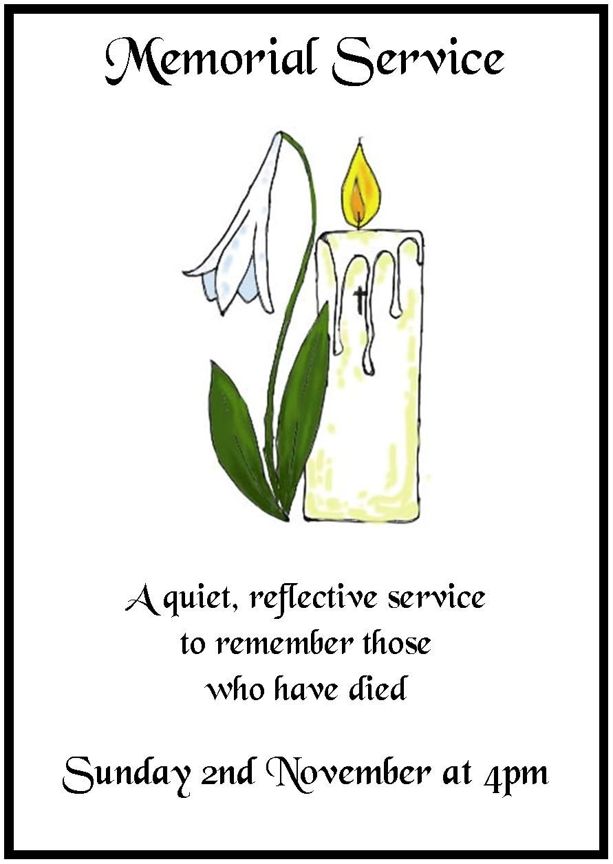 Sunday 2nd November Communion for All for All Saints' Day ~ 10am with activities for children during the service in the narthex Memorial Service for All Souls' Day ~ 4pm Sunday 9th November Communion for All for Remembrance Sunday ~ 10am - followed by an Act of Remembrance at 11am at the War Memorial with activities for children during the service in the narthex Sunday 16th November Communion for All Ages ~ 10am with activities for children during the service in the narthex Sunday 23rd November- Praise@10 ~ 10am Contemporary worship with songs and presentations for all ages Sunday 30th November Communion for All for Advent Sunday and Ian's final service here ~ 10am with activities for children during the service in the narthex Morning Prayer Fridays at 9am The church is open for private prayer daily until 4pm